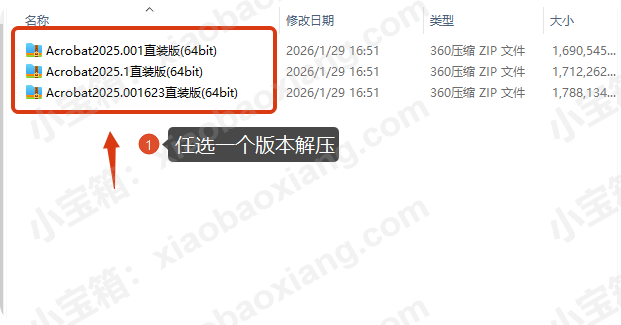 1.解压安装包:①鼠标右击【Acrobat2025.001(64bit)】压缩包②选择电脑上安装的解压软件③点击【解压到 Acrobat2025.001(64bit)】。